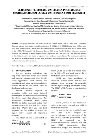 This paper describes the detection of the surface water area in Cirata dam, upstream Citarum, using a water index derived from Sentinel-2. MSI Level 1C (MSIL1C) data from 16 November 2018 were extracted into a water index such as the NDWI (Normalized Difference Water Index) model of Gao (1996), McFeeters (1996), Roger and Kearney (2004), and Xu (2006). Water index were analyzed based on the presence of several objects (water, vegetation, soil, and built-up). The research resulted in the ability of each water index to separate water and non-water objects. The results conclude that the NDWI of McFeeters (1996) derived from Sentinel-2 MSI showed the best results in detecting the surface water area of the reservoir