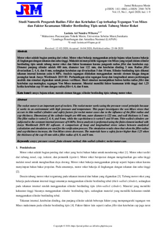 Motor roket adalah bagian penting dari roket. Motor roket bekerja menggunakan prinsip bejana tekan karena bekerja di lingkungan dengan tekanan dan suhu tinggi. Makalah ini menyelidiki tegangan von Mises yang terjadi dalam silinder berdinding tipis untuk tabung motor roket dan faktor keamanan karena pengaruh radius fillet dan ketebalan cap. Dimensi panjang silinder adalah 400 mm, diameter luar 122 mm, dan ketebalan dinding 5 mm. Radius fillet divariasikan 2, 4, 6, dan 8 mm, sedangkan ketebalan cap divariasikan 5 dan 10 mm. Silinder berdinding tipis dikenai tekanan internal konstan yaitu 6 MPa. Analisis tegangan dilakukan menggunakan metode elemen hingga dengan perangkat lunak Ansys Workbench 2019 R3. Perbandingan nilai tegangan hoop dan longitudinal antara perhitungan analitik dan simulasi digunakan untuk proses verifikasi. Hasil simulasi menunjukkan bahwa ketika radius fillet dan ketebalan cap meningkat, tegangan Von Mises menurun. Material memiliki faktor keamanan lebih tinggi dari 1,25 ketika ketebalan cap 10 mm dengan radius fillet 4, 6, dan 8 mm.