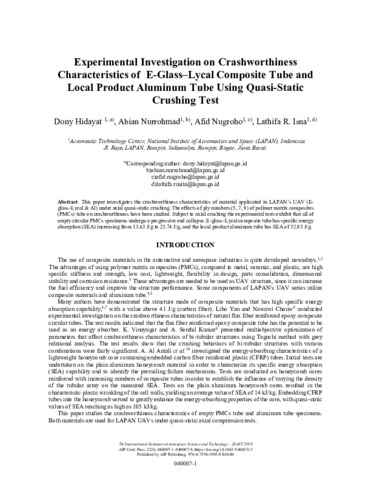 Dony Hidayat and Abian Nurrohmad and Afid Nugroho and , Lathifa R. Isna (2020) Experimental Investigation on Crashworthiness Characteristics of E-Glass– Lycal Composite Tube and Local Product Aluminum Tube Using Quasi-Static Crushing Test. AIP Conference Proceedings : 7th International Seminar on Aerospace Science and Technology – ISAST 2019, 2226. pp. 1-8.