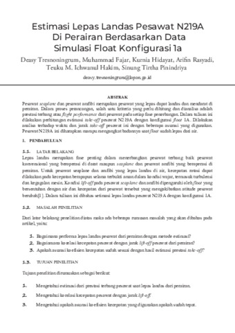 Deasy Tresnoningrum and Muhammad Fajar and Kurnia Hidayat and Arifin Rasyadi and Teuku Mohd Ichwanul Hakim and Sinung Tirtha Pinindriya (2021) Estimasi Lepas Landas Pesawat N219 A di Perairan Berdasarkan Data Simulasi Float Konfigurasi 1a. In: Bunga Rampai Inovasi Teknologi Penerbangan dari Pustekbang untuk Indonesia. IPB Press, Bogor, pp. 287-292. ISBN 978-623-256-808-2