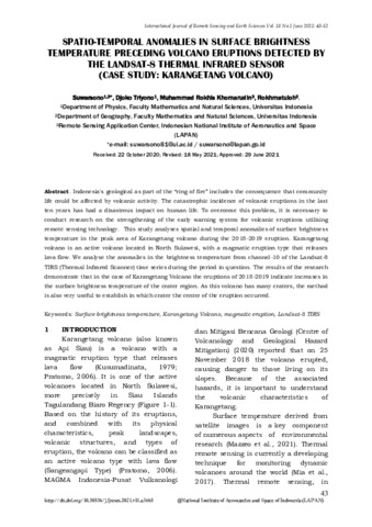 Suwarsono and Djoko Triyono and Muhammad Rokhis Khomarudin (2021) Spatio-temporal anomalies in surface brightness temperature preceding volcano eruptions detected by the Landsat-8 thermal infrared sensor (case study: Karangetang Volcano). International Journal of Remote Sensing and Earth Sciences, 18 (1). pp. 43-52. ISSN 0216-6739