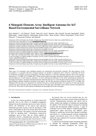 Elyas Palantei and Arif Hidayat and Wardi and Intan Sari Areni and Sunarno and Eko Setijadi and Dewiani Jamaluddin and Merna Baharuddin and Ahmad Khatami and Muhammad Sabirin Hadis and Akbar Hendra and Nurfitri Kaharuddin and Priska Wina and Mainsuri and Vickyarnoldo Wantura and Mulyadi (2021) 6 Monopole Elements Array Intelligent Antennas for IoT Based Environmental Surveillance Network. EPI International Journal of Engineering (EPIJE), 3 (2). pp. 126-131. ISSN 2615-5109