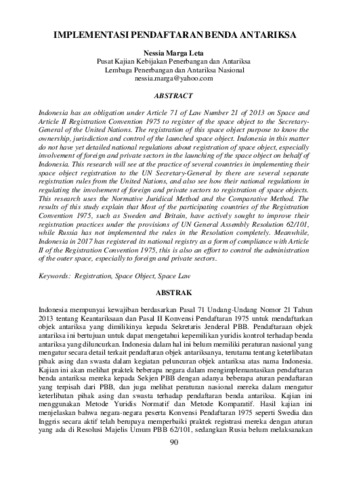 Indonesia mempunyai kewajiban berdasarkan Pasal 71 Undang-Undang Nomor 21 Tahun 2013 tentang Keantariksaan dan Pasal II Konvensi Pendaftaran 1975 untuk mendaftarkan objek antariksa yang dimilikinya kepada Sekretaris Jenderal PBB. Pendaftaraan objek antariksa ini bertujuan untuk dapat mengetahui kepemilikan yuridis kontrol terhadap benda antariksa yang diluncurkan. Indonesia dalam hal ini belum memiliki peraturan nasional yang mengatur secara detail terkait pendaftaran objek antariksanya, terutama tentang keterlibatan pihak asing dan swasta dalam kegiatan peluncuran objek antariksa atas nama Indonesia. Kajian ini akan melihat praktek beberapa negara dalam mengimplemantasikan pendaftaran benda antariksa mereka kepada Sekjen PBB dengan adanya beberapa aturan pendaftaran yang terpisah dari PBB, dan juga melihat peraturan nasional mereka dalam mengatur keterlibatan pihak asing dan swasta terhadap pendaftaran benda antariksa. Kajian ini menggunakan Metode Yuridis Normatif dan Metode Komparatif. Hasil kajian ini menjelaskan bahwa negara-negara peserta Konvensi Pendaftaran 1975 seperti Swedia dan Inggris secara aktif telah berupaya memperbaiki praktek registrasi mereka dengan aturan yang ada di Resolusi Majelis Umum PBB 62/101, sedangkan Rusia belum melaksanakan aturan dalam Resolusi tersebut sepenuhnya. Sementara itu, Indonesia pada tahun 2017 telah mendaftarkan national registry nya sebagai bentuk kepatuhan terhadap Pasal II Konvensi Pendaftaran 1975, hal ini juga sebagai upaya untuk penertiban administrasi keantariksaan khususnya pada pihak asing dan swasta.