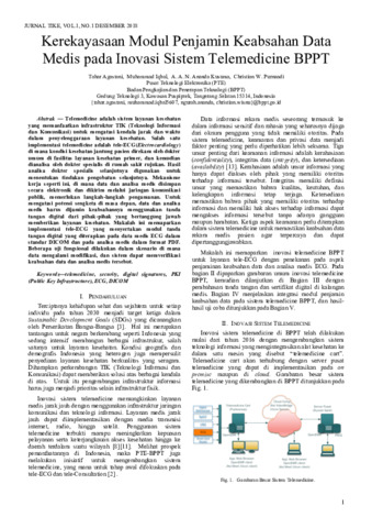 tangan digital dari pihak-pihak yang bertanggung jawab memberikan layanan kesehatan. Makalah ini memaparkan implementasi tele-ECG yang menyertakan modul tanda tangan digital yang diterapkan pada data medis ECG dalam standar DICOM dan pada analisa medis dalam format PDF. Beberapa uji fungsional dilakukan dalam skenario di mana data mengalami modifikasi, dan sistem dapat memverifikasi keabsahan data dan analisa medis tersebut