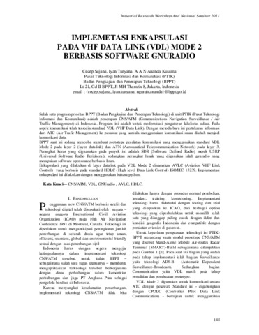 Salah satu program prioritas BPPT (Badan Pengkajian dan Penerapan Teknologi) di unit PTIK (Pusat Teknologi Informasi dan Komunikasi) adalah penerapan CNS/ATM (Communications Navigation Surveillance / Air Traffic Management) di Indonesia. Program ini adalah untuk modernisasi pengaturan lalulintas udara. Pada aspek komunikasi telah tersedia standard VDL (VHF Data Link). Dengan metoda baru ini pertukaran informasi dari ATC (Air Trafic Management) ke pesawat yang semula menggunakan komunikasi suara diubah menjadi komunikasi data. BPPT saat ini sedang mencoba membuat prototype peralatan komunikasi yang menggunakan standard VDL Mode 2 pada layer 2 (layer datalink) dan ATN (Aeronautical Telecommunication Network) pada layer 3. Perangkat keras yang diguanakan pada proyek ini adalah SDR (Software Defined Radio) merek USRP (Universal Software Radio Peripheral), sedangkan perangkat lunak yang digunakan ialah gnuradio yang merupakan software opensource berbasis linux. Enkapsulasi yang dilakukan di layer datalink pada VDL Mode 2 dinamakan AVLC (Aviation VHF Link Control) yang berbasis pada standard HDLC (High level Data Link Control) ISO/IEC 13239. Implementasi enkapsulasi ini dilakukan dengan menggunakan bahasa python.