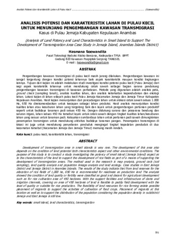 Pengembangan kawasan transmigrasi di pulau kecil masih jarang dilakukan. Pengembangan kawasan ini sangat tergantung dengan kondisi potensi lahannya baik aspek karakteristik maupun kondisi lingkungan lainnya. Tujuan dari kajian ini adalah melakukan studi investigasi kondisi potensi pulau kecil (Pulau Jemaja) dari segi aspek karateristik lahannya untuk mendukung cetak sawah sebagai bagian sarana pendukung pengembangan kawasan transmigrasi di kawasan perbatasan. Metode yang digunakan adalah analisis peta, ground check (sampling tanah), analisis kualitas lahan, dan analisis keterkaitan kependudukan dan ekologi lahan. Lokasi kajian di lahan wilayah pulau kecil Pulau Jemaja Kecamatan Jemaja dan Jemaja Timur Kabupaten Kepulauan Anambas. Hasil kajian menunjukkan dari pencadangan lahan untuk alokasi cetak sawah seluas 1.000 Ha, 650 Ha direkomendasikan untuk kesiapan sebagai lahan produksi. Hasil analisis menunjukkan kondisi kualitas lahan atau kesuburan lahan yang tergolong baik dan layak untuk pengembangan pertanian produktif seperti untuk budidaya tanaman padi seluas 450 Ha. Dengan didukung sarana dan prasarana bendung dan saluran irigasi, lahan seluas 450 Ha tersebut layak untuk cetak sawah dengan tingkat kualitas lahan/kesuburan lahan yang sesuai untuk tanaman padi. Kelayakan sumberdaya lahan untuk pertanian padi sawah dimungkinkan penempatan transmigran untuk mendukung aktivitas budidaya tanaman pangan. Penempatan transmigran di lokasi ini juga untuk mendukung penyebaran penduduk mengingat tingkat kepadatan penduduk di dua kecamatan tersebut (Kecamatan Jemaja dan Jemaja Timur) memang masih rendah.