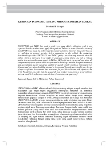 Bernhard H. Sianipar (2015) Kebijakan Indonesia Tentang Mitigasi Sampah Antariksa. In: Kajian Kebijakan Dan Informasi Kedirgantaraan. Mitra wacana media, Jakarta, pp. 1-17.