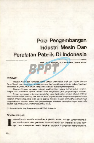 Industri Mesin dan Peralatan Pabrik (IMPP) merupakan salah satu bagian Industri Dasar/Kunci yang memegang peranan penting bagi pendalaman struktur industri nasional, oleh sebab itu perlu perencanaan yang hati-hati untuk pola pengembangannya. Tinjauan-tinjauan terhadap wilayah pertumbuhan, sarana pertumbuhan, pengembangan dan pendanaan dipakai sebagai dasar penyusunan pola pengembangan tersebut.
