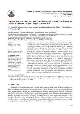 Naryanto, Heru Sri and Prawiradisastra, Firman and Kristijono, Agus and Ganesha, Deliyanti Penataan kawasan pasca bencana tanah longsor di Puncak Pass, Kecamatan Cipanas, Kabupaten Cianjur Tanggal 28 Maret 2018 = Post landslide disaster area arrangement in Puncak Pass, Cipanas Sub-District, Cianjur District on 28 March 2018. Jurnal Pengelolaan Sumber Daya Alam dan Lingkungan = Journal of Natural Resources and Environmental Management, 9 (4). pp. 1053-1065. ISSN 2460-5824