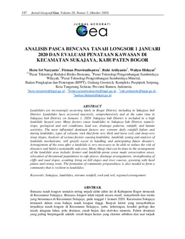 Naryanto, Heru Sri and Prawiradisastra, Firman and Ardiyanto, Ruki and Hidayat, Wahyu (2020) Analisis pasca bencana tanah longsor 1 Januari 2020 dan evaluasi penataan kawasan di Kecamatan Sukajaya, Kabupaten Bogor. Jurnal Geografi Gea, 20 (2). pp. 197-212. ISSN 2549-7529
