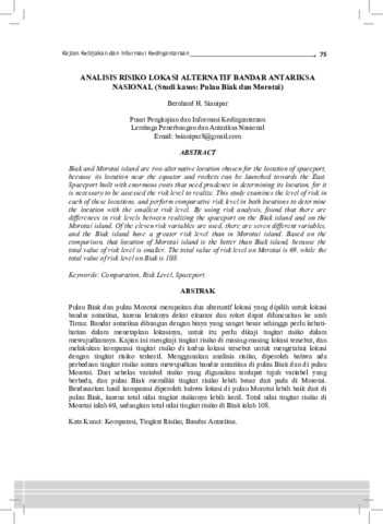 Pulau Biak dan pulau Morotai merupakan dua alternatif lokasi yang dipilih untuk lokasi bandar antariksa, karena letaknya dekat ekuator dan roket dapat diluncurkan ke arah Timur. Bandar antariksa dibangun dengan biaya yang sangat besar sehingga perlu kehati�hatian dalam menetapkan lokasinya, untuk itu perlu dikaji tingkat risiko dalam mewujudkannya. Kajian ini mengkaji tingkat risiko di masing-masing lokasi tersebut, dan melakukan komparasi tingkat risiko di kedua lokasi tersebut untuk mengetahui lokasi dengan tingkat risiko terkecil. Menggunakan analisis risiko, diperoleh bahwa ada perbedaan tingkat risiko antara mewujudkan bandar antariksa di pulau Biak dan di pulau Morotai. Dari sebelas variabel risiko yang digunakan terdapat tujuh variabel yang berbeda, dan pulau Biak memiliki tingkat risiko lebih besar dari pada di Morotai. Berdasarkan hasil komparasi diperoleh bahwa lokasi di pulau Morotai lebih baik dari di pulau Biak, karena total nilai tingkat risikonya lebih kecil. Total nilai tingkat risiko di Morotai ialah 69, sedangkan total nilai tingkat risiko di Biak ialah 108