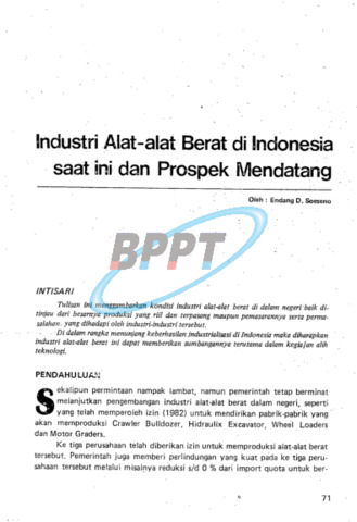 Tulisan ini menggambarkan kondisi industri alat-alat berat di dalam negeri baik ditinjau dari besarnya produksi yang riil dan terpasang maupun pemasarannya serta permasalahan, yang dihadapi oleh industri-industri tersebut. Di dalam rangka menunjang keberhasilan industrialisasi di Indonesia maka diharapkan industri alat-alat berat ini dapat memberikan sumbangannya terutama dalam kegiatan alih teknologi.