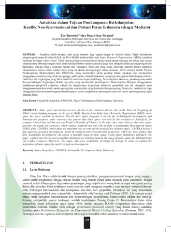Antariksa telah menjadi area yang menarik bagi negara-negara di seluruh dunia. Sejak dimulainya program pendaratan di bulan NASA, ke Misi MARS terbaru dari <i>India Space Research Organization </i> (ISRO), antariksa melayani berbagai varian motif.Tidak semua program keantariksaan hanya untuk pengembangan teknologi dan tujuan kemanusiaan, beberapa negara telah membuktikan bahwa medan antariksa juga bisa menjadi medan perang yang belum dipetakan, sebagai contoh Amerika Serikat dan Tiongkok. Pada saat yang sama, beberapa percaya bahwa antariksa menyediakan sarana untuk sumber daya yang menjamin kelangsungan hidup manusia. Salah satunya adalah Tujuan Pembangunan Berkelanjutan dari UNOOSA, yang memainkan peran penting dalam menjaga dan memastikan penggunaan antariksa yang tidak menganggu perdamaian. Setelah trajektori menuju pembangunan berkelanjutan dibuat, maka dari itu lingkungan yang tidak ramah di antariksa dapat berkurang. Pembangunan ekonomi, pembangunan sosial dan perlindungan lingkungan adalah tiga pilar yang membentuk pembangunan berkelanjutan. Dengan menggunakan pendekatan geopolitik antariksa, tulisan ini menjelaskan bagaimana dinamika geopolitik saat ini mengarah pada penggunaan antariksa untuk medan perang dan sumber daya yang berkaitan dengan perang. Selain itu, makalah ini juga menggunakan konsep pembangunan berkelanjutan untuk menjelaskan pentingnya antariksa untuk pembangunan jangka panjang Bumi.