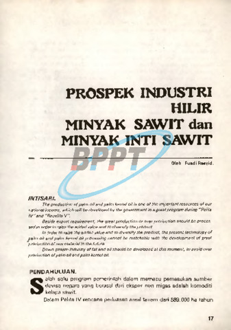 Rasyid, Fuadi (1986) Prospek industri hilir minyak sawit dan minyak inti sawit. Majalah BPPT (X): 2. pp. 17-26. ISSN 0216 - 6569