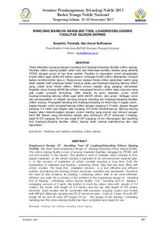 Sunarko, Sunarko and Purwadi, Purwadi and Sufmawan, Asnul (2017) RANCANG BANGUN HANDLING TOOL LOADING/UNLOADING FASILITAS SILIKON DOPING. SEMINAR PENDAYAGUNAAN TEKNOLOGI NUKLIR. pp. 397-403. ISSN 2540-8062