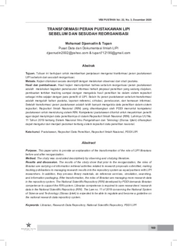 Djaenudin, djae and Tupan, Tupan (2020) Transformasi Peran Pustakawan LIPI Sebelum dan Sesudah Reorganisasi. VISI PUSTAKA, 22 (3): 1. pp. 169-180. ISSN 1411-2256