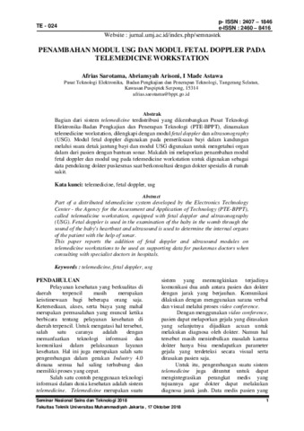 Sarotama, Afrias and Arisoni, Abriansyah and Astawa, I Made (2018) Penambahan modul USG dan modul fetal doppler pada telemedicine workstation. In: Seminar Nasional Sains dan Teknologi 2018, 17 Oktober 2018, Fakultas Teknik Universitas Muhammadiyah Jakarta.