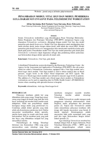 Sarotama, Afrias and Tuntari, Beti and Suryana, Yaya and Febryarto, Rony (2018) Penambahan modul vital sign dan modul pemeriksa gula darah non invasive pada telemedicine workstation. In: Seminar Nasional Sains dan Teknologi 2018, 17 Oktober 2018, Fakultas Teknik Universitas Muhammadiyah Jakarta.