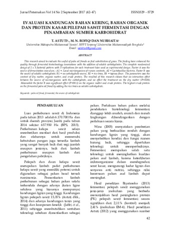 Astuti, T. and Rofiq, Muhamad Nasir and Nurhaita, . (2017) Evaluasi kandungan bahan kering, bahan organik dan protein kasar pelepah sawit fermentasi dengan penambahan sumber karbohidrat. Jurnal Peternakan, 14 (2). pp. 42-47. ISSN 1829-8729