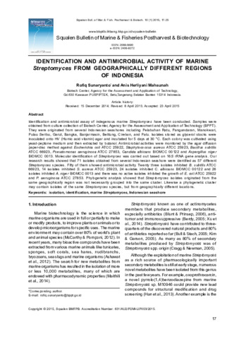Sunaryanto, Rofiq and Mahsunah, Anis Herliyani (2022) Identification and antimicrobial activity of marine streptomyces from geographically different regions of Indonesia. Squalen Bulletin of Marine & Fisheries Postharvest & Biotechnology, 17 (2). ISSN 2089-5690