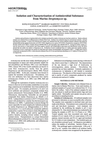 Sunaryanto, Rofiq and Marwoto, Bambang and Irawadi, Tun Tedja (2010) Isolation and characterization of antimicrobial substance from marine streptomyces sp. MICROBIOLOGY INDONESIA, 4 (2). ISSN 1978-3477