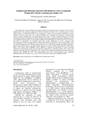 Sunaryanto, Rofiq and Marwanta, Edy (2015) Isolation and molecular structure elucidation of active compound produced by marine actinomycetes isolate A32. Annales Bogorienses, 19 (2). pp. 13-19.