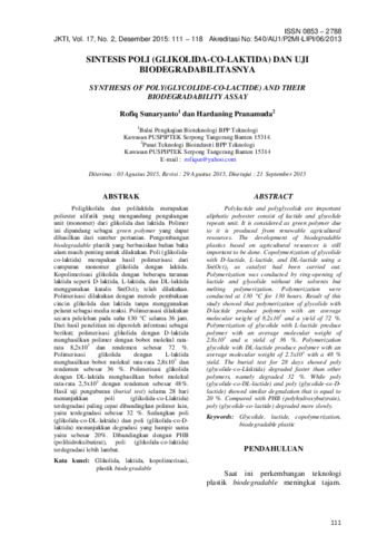 Poliglikolida dan polilaktida merupakan poliester alifatik yang mengandung pengulangan unit (monomer) dari glikolida dan laktida. Polimer ini dipandang sebagai green polymer yang dapat dihasilkan dari sumber pertanian. Pengembangan biodegradable plastik yang berbasiskan bahan baku alam masih penting untuk dilakukan. Poli (glikolida co-laktida) merupakan hasil polimerisasi dari campuran monomer glikolida dengan laktida. Kopolimerisasi glikolida dengan beberapa turunan laktida seperti D-laktida, L-laktida, dan DL-laktida menggunakan katalis Sn(Oct)2 telah dilakukan. Polimerisasi dilakukan dengan metode pembukaan cincin glikolida dan laktida tanpa menggunakan pelarut sebagai media reaksi. Polimerasasi dilakukan secara pelelehan pada suhu 130 °C selama 36 jam. Dari hasil penelitian ini diperoleh informasi sebagai berikut; polimerisasi glikolida dengan D-laktida menghasilkan polimer dengan bobot molekul rata rata 8,2x103 dan rendemen sebesar 72 %. Polimerisasi glikolida dengan L-laktida menghasilkan bobot molekul rata-rata 2,8x103 dan rendemen sebesar 36 %. Polimerisasi glikolida dengan DL-laktida menghasilkan bobot molekul rata-rata 2,5x103 dengan rendemen sebesar 48%. Hasil uji penguburan (burial test) selama 28 hari menunjukkan poli (glikolida-co-Llaktida) terdegradasi paling cepat dibandingkan polimer lain, yaitu terdegradasi sebesar 32 %. Sedangkan poli (glikolida-co-DL-laktida) dan poli (glikolida-co-D laktida) menunjukkan degradasi yang hampir sama yaitu sebesar 20%. Dibandingkan dengan PHB (polihidroksibutirat), poli (glikolida-co-laktida) terdegradasi lebih lambat.