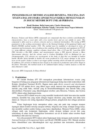 Maulana, Rendi and Sunaryanto, Rofiq and Situmorang, Charles (2020) Pengembangan metode analisis benzena, toluena, dan xylena dalam udara lingkungan kerja menggunakan in house metode di PT Unilab Perdana. TechLINK, 4 (1). ISSN 2581-2319