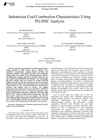 Putra, Hanafi Prida and Nuryadi, Agus Prasetyo and Hariana, Hariana and Nainggolan, Lan Marakkup Tua (2021) Indonesian coal combustion characteristics using TG-DSC Analysis. In: Conference on Innovation in Science And Technology (ICIST 2020).