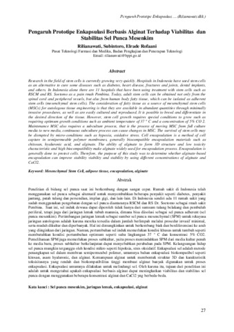 Rilianawati, Rilianawati and Subintoro, Subintoro and Rofaani, Elrade (2018) Pengaruh prototipe enkapsulasi berbasis alginat terhadap viabilitas dan stabilitas sel punca mesenkim. Jurnal Biotek Medisiana Indonesia, 7 (1). pp. 27-38. ISSN 2301-5810