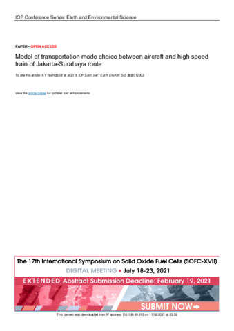 Y Nurhidayat, A and Widyastuti, H and Utomo, Djoko Prijo (2018) Model of transportation mode choice between aircraft and high speed train of Jakarta-Surabaya route. In: CITIES 2017: Multi Perspectives on Peri-Urban Dynamics Towards Sustainable Development, Surabaya - Jawa Timur - Indonesia, 18 October 2017.