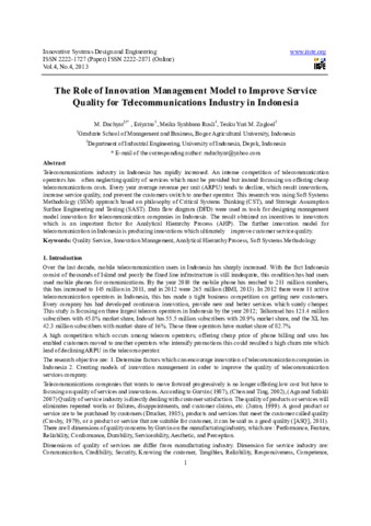 Dachyar, M. and ., Eriyatno and Rusli, Meika Syahbana and Zagloel, Teuku Yuri M. (2013) The Role of innovation management model to improve service quality for telecommunications industry in Indonesia. Innovative Systems Design and Engineering, 4 (4). ISSN 2222-2871