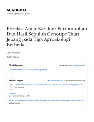 Maretta, Delvi and ., Sobir and Helianti, Is and ., Purwono and Santosa, Edi (2021) Korelasi antara karakter pertumbuhan dan hasil sepuluh genotipe talas jepang pada tiga agroekologi berbeda = Correlation between growth and yield characters of ten japanese taro genotypes grown in different agroecologies. Buletin Palawija, 19 (2). pp. 82-92. ISSN 2615-8108
