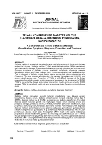 Hardianto, Dudi (2020) Telaah komprehensif diabetes melitus: Klasifikasi, gejala, diagnosis, pencegahan dan pengobatan: A comprehensive review of diabetes mellitus: Classification, symptoms, diagnosis, prevention, and treatment. Jurnal Bioteknologi dan Biosains Indonesia (JBBI), 7 (2). pp. 304-317. ISSN 2548-611X