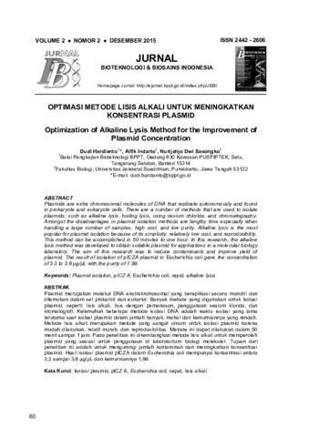 Hardianto, Dudi and Indarto, Aldik and Sasongko, Nurtjahtjo Dwi (2015) Optimasi metode lisis alkali untuk meningkatkan konsentrasi plasmid: Optimization of alkaline lysis method for the improvement of plasmid concentration. Jurnal Bioteknologi dan Biosains Indonesia, 2 (2). pp. 60-64. ISSN 2442-2606