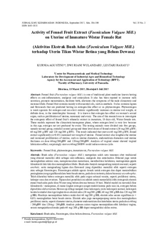 Agustini, Kurnia and Wulandari, Dwi Riani and Rahayu, Lestari (2017) Activity of fennel fruit extract (foeniculum vulgare mill.) on uterine of immature wistar female rat: Aktivitas ekstrak buah adas (foeniculum vulgare mill.) terhadap uterin tikus wistar betina yang belum dewasa. Jurnal Ilmu Kefarmasian Indonesia, 15 (2). pp. 186-190. ISSN 1693-1831