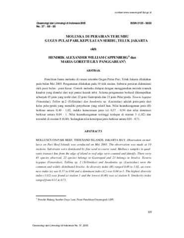 Cappenberg, Hendrik Alexander William and Panggabean, Maria Goretti Lily (2005) Moluska di perairan terumbu gugus Pulau Pari, Kepulauan Seribu, Teluk Jakarta. Oseanologi dan Limnologi di Indonesia (37). pp. 69-80. ISSN 0125-9830