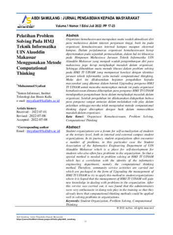 Muhammad, Syafaat (2022) Pelatihan problem solving pada HMJ Teknik Informatika UIN Alauddin Makassar menggunakan metode computational thinking. Abdi Samulang: Jurnal pengabdian kepada masyarakat, 1 (1): 3. pp. 17-23. ISSN 2964-7215