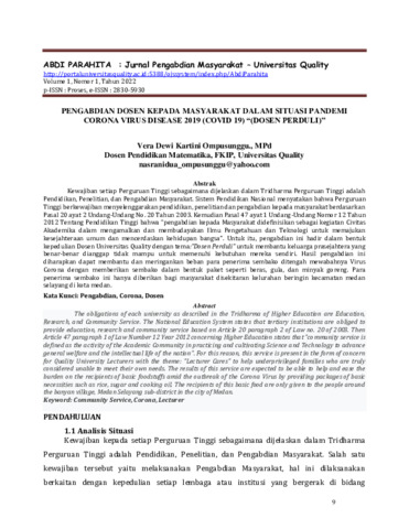 Vera, Dewi Kartini Ompusunggu (2022) Pengabdian dosen kepada masyarakat dalam situasi pandemi Corona virus disease 2019 (Covid 19) “(dosen perduli)”. Abdi Parahita, 1 (1): 2. pp. 9-19. ISSN 2962-6005