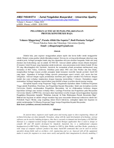 Yohanes, Sibagariang and Parada, Afkiki Eko Saputra and Budi, Florianta Tarigan (2022) Pelatihan Autocad 3D pada pelaksanaan proyek konstruksi baja. Abdi Parahita, 1 (1): 4. pp. 28-32. ISSN 2962-6005