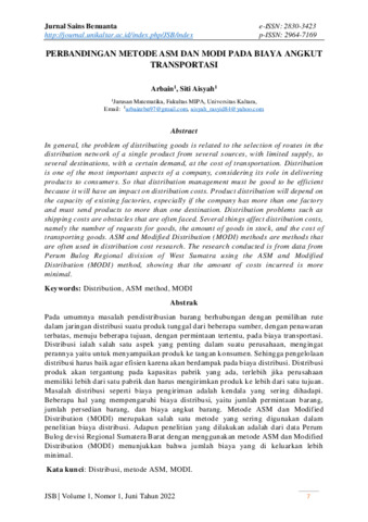 Arbain, Arbain and Siti, Aisyah (2022) Perbandingan metode ASM dan MODI pada biaya angkut transportasi. Jurnal Sains Benuanta, 1 (1): 2. pp. 7-14. ISSN 2964-7169