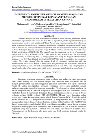 Muhammad, Ayyub and Muh. Azir, Muzakkir and Renata, Jayanti and Ratna Dwi, Christyanti and Erma, Fatimah (2022) Implementasi GUSCIPUS (GUI Scilab Kepuasan) dalam mengukur tingkat kepuasan pelayanan transportasi di Pelabuhan Kayan II. Jurnal Sains Benuanta, 1 (1): 5. pp. 32-39. ISSN 2964-7169
