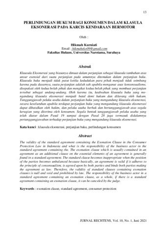 Hikmah Kurniati (2021) Perlindungan hukum bagi konsumen dalam klasula eksonerasi pada karcis kendaraan bermotor. Jurnal Rechtens, 10 (1). pp. 13-26. ISSN 1907-7114