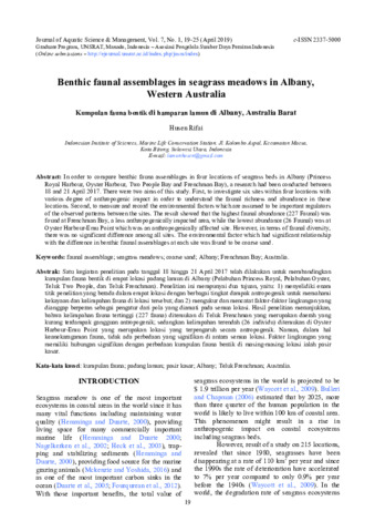 Rifai, Husen (2019) Benthic faunal assemblages in seagrass meadows in Albany, Western Australia. Aquatic Science & Management, 7 (1): 4. pp. 19-25. ISSN 2337-4403