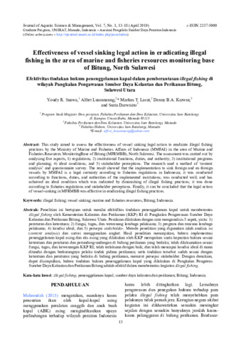 Suawa, Youdy R. and Luasunaung, Alfret and Lasut, Markus T. and Karwur, Denny B.A. and Darwisito, Suria (2019) Effectiveness of vessel sinking legal action in eradicating illegal fishing in the area of marine and fisheries resources monitoring base of Bitung, North Sulawesi. Aquatic Science & Management, 7 (1): 3. pp. 13-18. ISSN 2337-4403