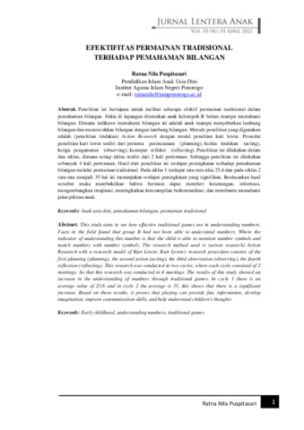 Ratna, Nila Puspitasari (2022) Efektifitas permainan tradisional terhadap pemahaman bilangan. Lentera Anak, 3 (1): 1. pp. 1-16. ISSN 2746-4121