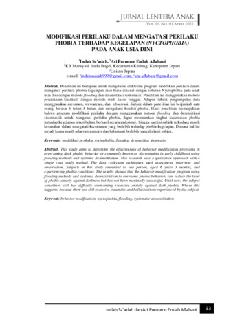 Indah, Sa’adah and Ari, Purnomo Endah Aflahani (2022) Modifikasi perilaku dalam mengatasi perilaku phobia terhadap kegelapan (nyctophobia) pada anak usia dini. Lentera Anak, 3 (1): 3. pp. 33-42. ISSN 2746-4121
