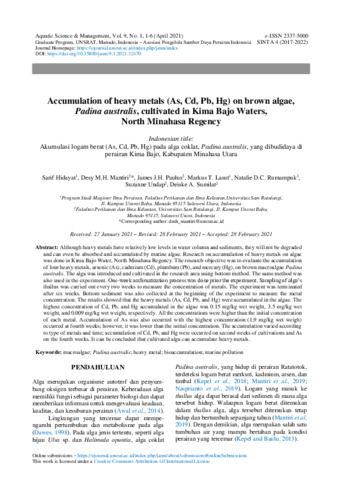 Sarif, Hidayat and Desy M.H., Mantiri and James J.H., Paulus and Markus T., Lasut and Natalie D.C., Rumampuk and Suzanne, Undap and Deiske A., Sumilat (2021) Accumulation of heavy metals (As, Cd, Pb, Hg) on brown algae, Padina australis, cultivated in Kima Bajo Waters, North Minahasa Regency. Aquatic Science & Management, 9 (1): 1. pp. 1-6. ISSN 2337-4403