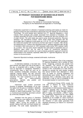 A laboratory experiment on utilization of seaweed-containing solid wastes as media for growing mushrooms was conducted by researchers from the Institute for Environmental Technology. The solid wastes were obtained from PT. Agarindo Bogatama, a food industry which produces jelly powder processed from seaweed of Gracilaria. The company generates 60 tones of solid wastes of seaweed per-day that contained 70% of water content. The solid media was used to grow Auricularia polytricha, Pleurotus astreatus, and Ganoderma lucidum. Some mixed media were prepared with the percentage ratio of sawdust to solid waste as 0, 25, 50, 75, and 100. After sterilization the media were planted with mushrooms and then were kept in incubator. After 28-day the basidiomas of G. lucidum was developed while P. astreatus appeared after 36-day of incubation. Both were grown on 100% seaweed media (using 100% sawdust media as a control). This very early results indicated that solid waste of seaweeds have an additional value which can be used as media for mushrooms plantation. Implementation waste to product as a part of cleaner production approach should be disseminated to the industries, especially SMEs like PT. Agarindo Bogatama, who are concern to the environment.