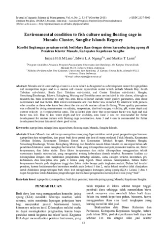 Inayati, H.G.M Lano and Edwin, L.A. Ngangi and Markus, T. Lasut (2018) Environmental condition to fish culture using floating cage in Manalu Cluster, Sangihe Islands Regency. Aquatic Science & Management, 6 (2): 4. pp. 53-57. ISSN 2337-4403